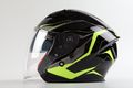 Helma Maxx OF 878 černo / zelená reflexní je otevřená skútrová helma s plexi a sluneční clonou.