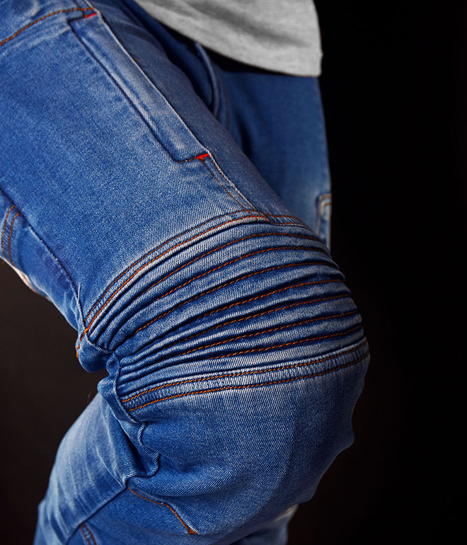 Chrániče jsou uchycené v námi patentované kapse, kterou nenajdete na žádných jiných motorkářských jeansech!