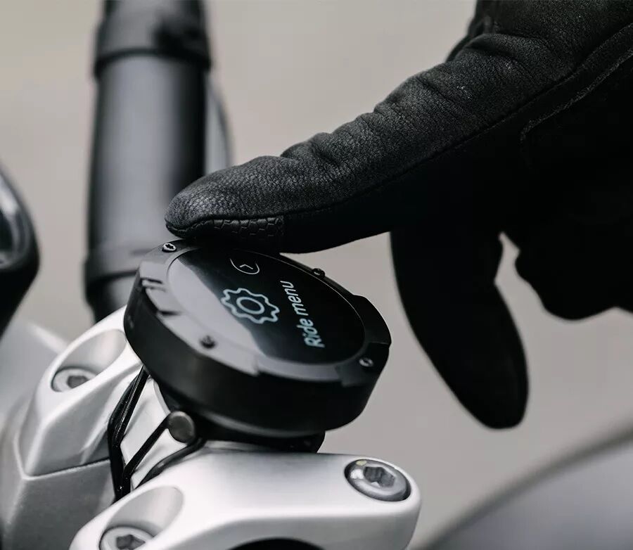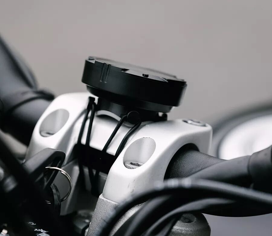 Minimalistická navigace na motorku s kovovým rámečkem.