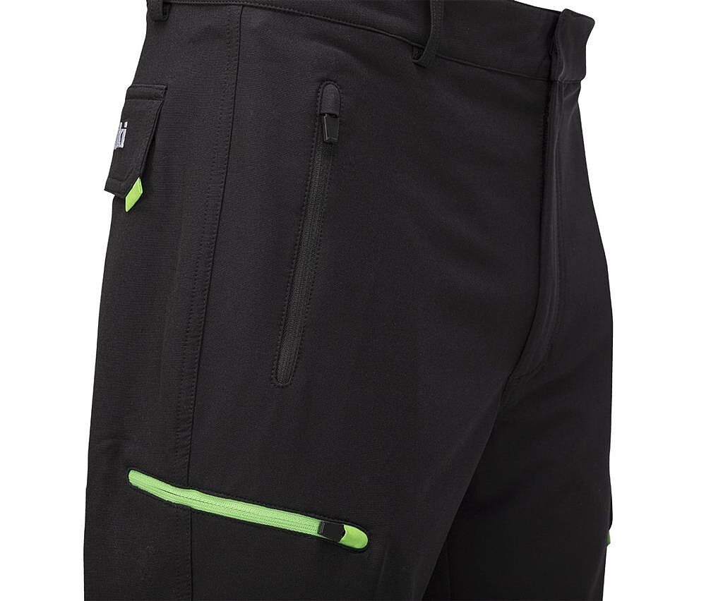 Též obě přední kapsy mají zapínání na zip. Obě zadní kapsy spolu s kapsou na levé nohavici mají klopy.